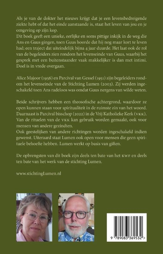Alice Majoor (1956) en Parcival van Gessel (1951) zijn oprichters van Stichting Lumen en begeleiders rondom het levenseinde. Zij werden in 2003 ingeschakeld voor een begeleiding waarbij een van de partners (Ans) radeloos was omdat de andere partner (Guus) nergens van wilde weten. De dokter had hen net verteld dat Guus een levensbedreigende ziekte had en dat het einde aanstaande was. Hun eigen leven, en dat van hun omgeving, stond van het ene op het andere moment op zijn kop.